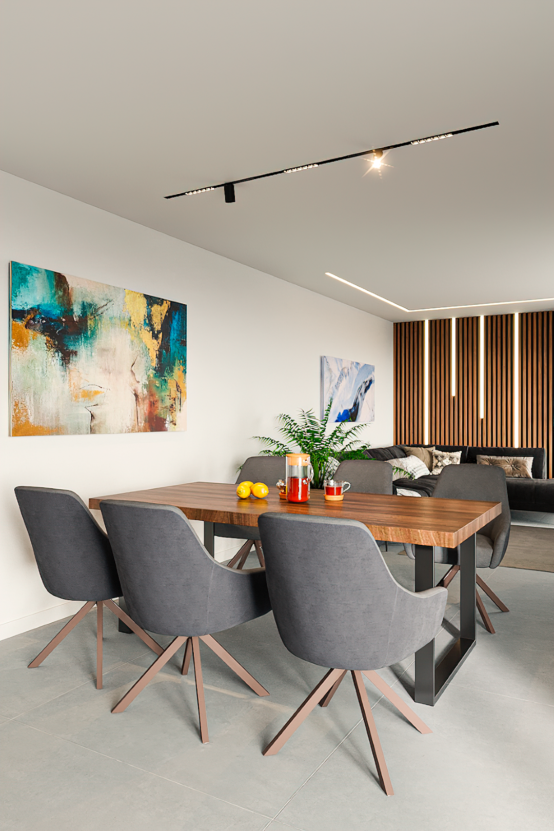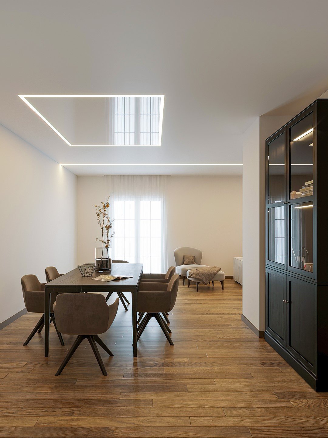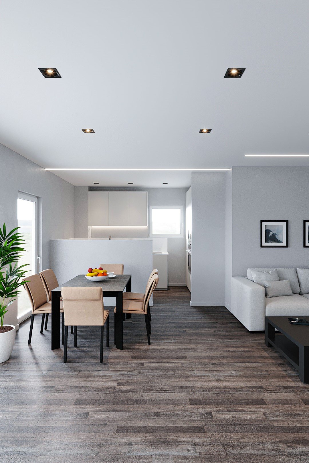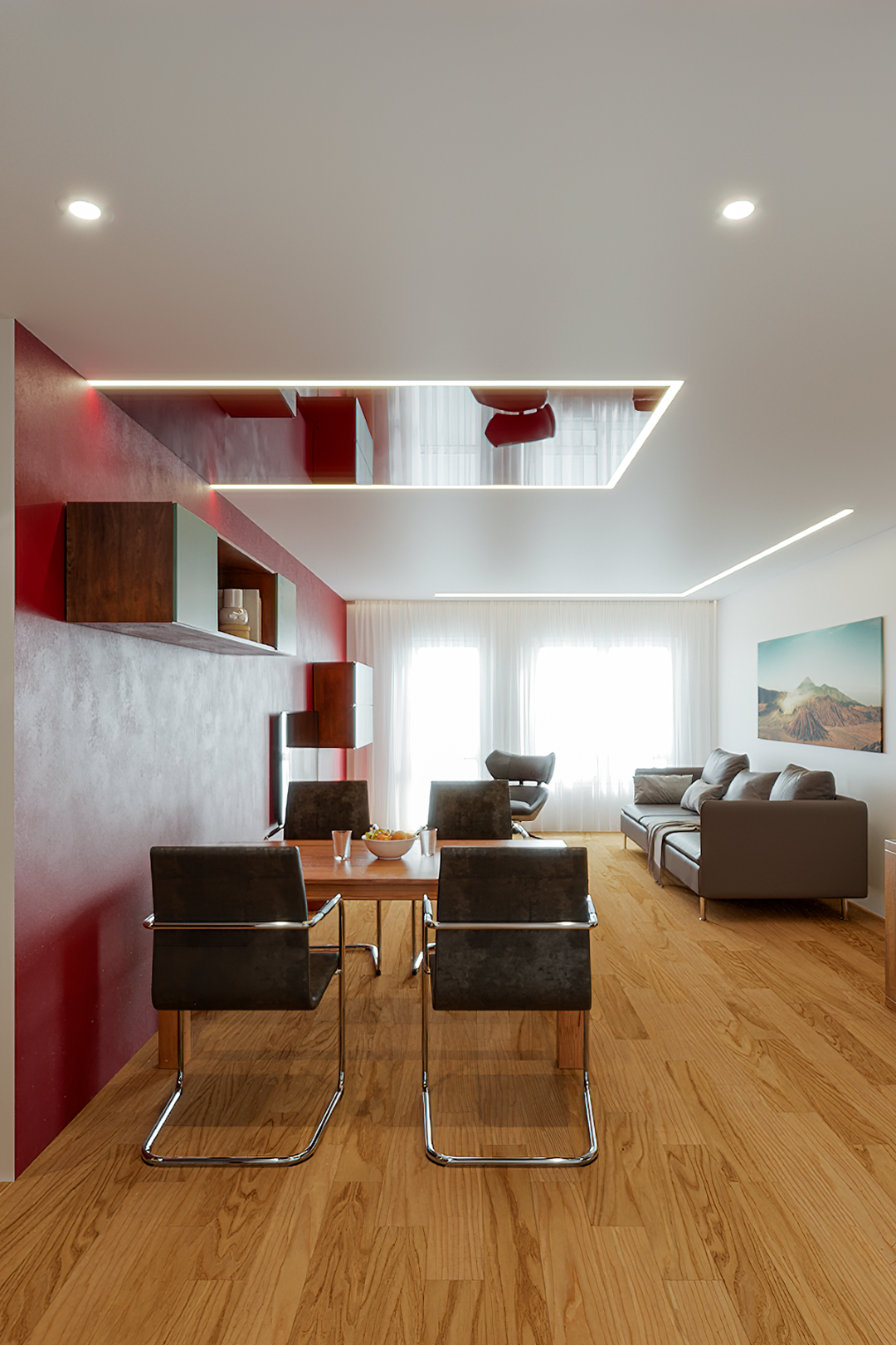 Ein Wohnzimmer, in dem Sie jeden Augenblick in vollen Zügen genießen – von morgens bis abends. Die Spanndecke mit ihrer atmosphärischen Beleuchtung setzt die richtigen Akzente für Ihren persönlichen Wohlfühlort.